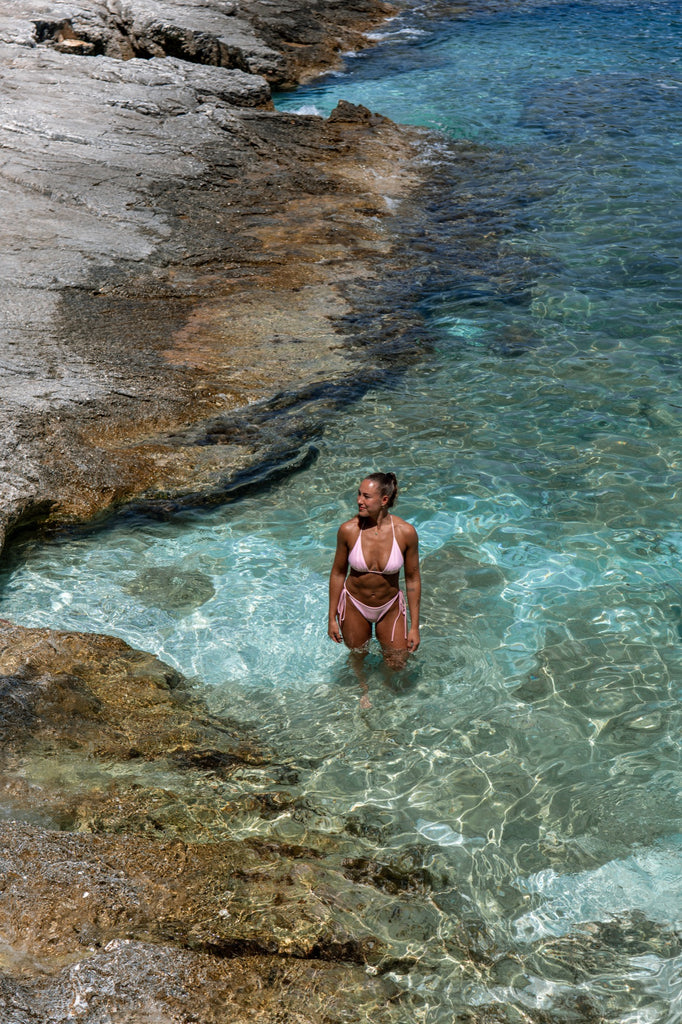 The Victoria bikini is a new version of the perfect basic triangle bikini you've been looking for! With ties on the sides, you can adjust it to your liking. For this bikini, you can choose between Cheeky and Normal coverage. They are completely identical in the front, but different in the back with normal having more coverage. The bikini is sustainably produced with recycled fabrics.